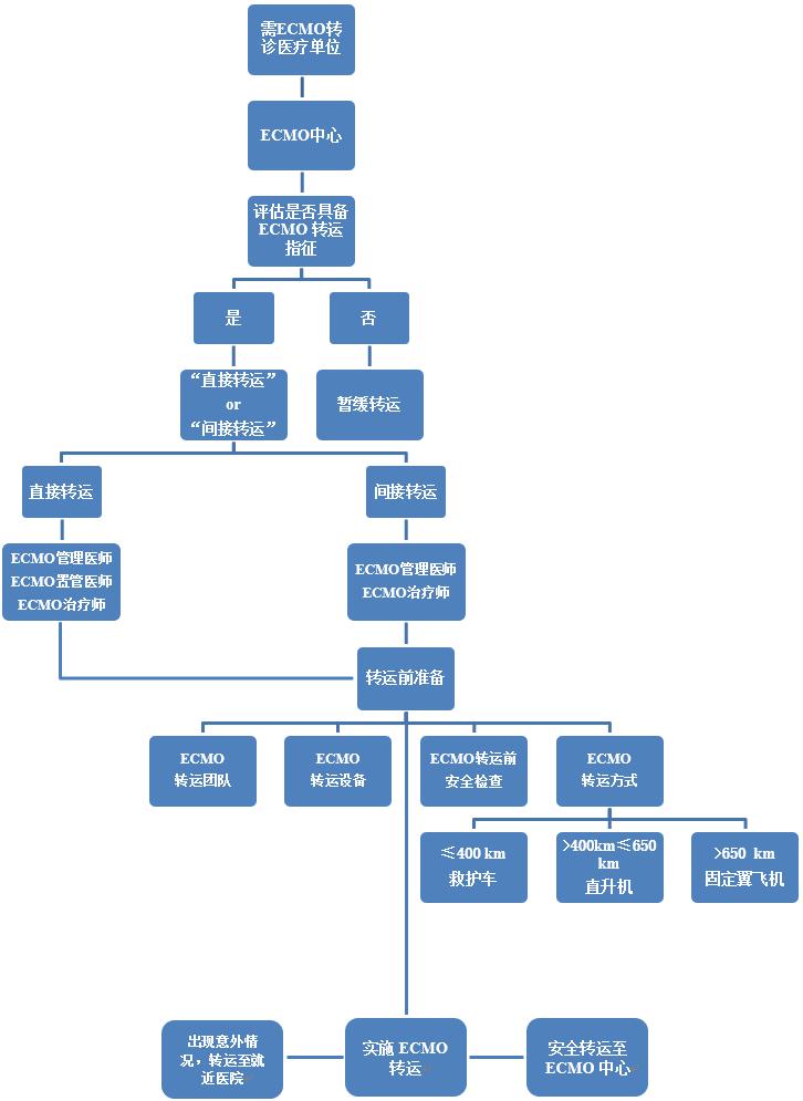 ECMO从置管、启动、运转、监测和护理都需要专业的团队来完成。因此,患者需要在高容量ECMO中心接受治疗。ECMO转运团队成立后,这些团队可以在转诊机构启动ECMO,并将接受ECMO治疗的患者转运至ECMO中心[11]。