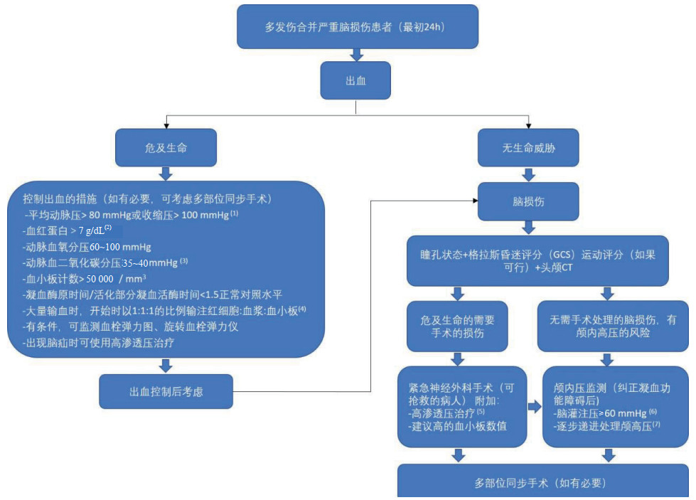 创伤性脑损伤(traumatic brain injury,TBI)具有很高的致死率和致残率,而大出血是创伤后可预防的首位致死原因。多发伤合并脑损伤的处理具有很大的挑战性,目前还缺乏针对这些患者监测与处理的指南。因此,世界急诊外科学会(WSES)组织各国40名专家,包括急诊外科医生、神经外科医生和重症医生,制定了成人多发伤合并严重脑损伤患者伤后24 h的监测和管理措施,处理流程见图 1。采用改进的Delphi法,以专家一致性大于70%为界线,形成16条建议,旨在为此类患者的处理提供指导意见,但并不能取代临床医师的决策,也不排除其他符合实践标准的方法。