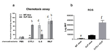 | A:与CLP组PBS比较, aP<0.05,bP<0.01;与WT组PBS比较, cP<0.05,dP <0.01。B:与CLP组比较, eP<0.05,fP <0.01。CLP,cecal ligation and puncture,盲肠结扎穿孔术;ROS,reactive oxygen species,氧活性物质。 图 1 CYTL1对小鼠中性粒细胞的趋化活性和对ROS释放水平的影响。 Fig 1 The chemotactic activity of CYTL1 on mouse neutrophils and its influence on ROS release |
