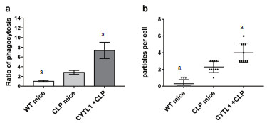 | 与CLP组比较, aP<0.05。CLP,cecal ligation and puncture,盲肠结扎穿孔术 图 2 CYTL1对各组小鼠中性粒细胞吞噬能力的影响 Fig 2 Effect of CYTL1 on the phagocytosis of neutrophils in mice of each group |