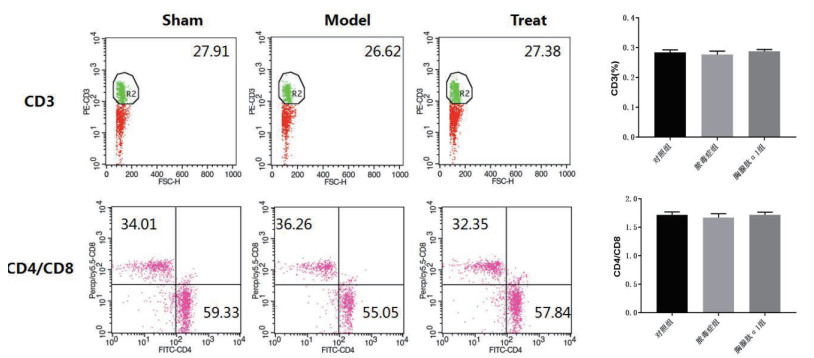 | sham空白对照组;model脓毒症组;Treat胸腺肽组 图 1 小鼠血浆T淋巴细胞流式细胞分析。 Fig 1 Flow cytometric analysis of T lymphocytes in mice |