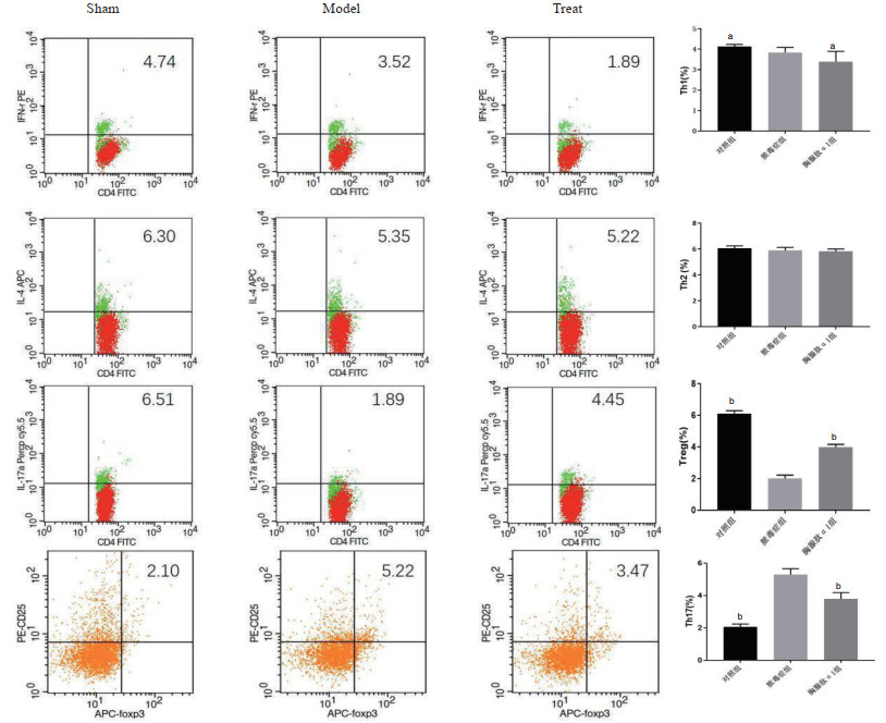 | sham:空白对照组;model:脓毒症组;Treat:胸腺肽组(aP<0.05;bP<0.01) 图 2 小鼠血浆T细胞分化流式分析 Fig 2 Flow cytometric analysis of T lymphocyte differentiation in mice |