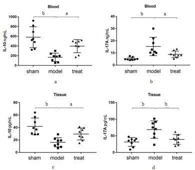 | sham空白对照组;model脓毒症组;Treat胸腺肽组;blood血浆;Tissue肺组织(上横线为最大值,下横线为最小值,中间横线为均值,aP<0.05;bP<0.01) 图 3 小鼠血浆、肺组织中IL-10、IL-17(Elisa)。 Fig 3 Determination of IL-10 and IL-17 in mice (Elisa) |