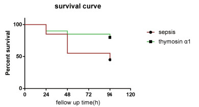 | LPS诱导的脓毒症大鼠的存活率在使用胸腺肽α1后得到改善。对Kruskal-Wallis生存曲线进行Log-rank检验结果胸腺肽α1治疗组(n=10)生存率明显高于LPS诱导脓毒症组(n=10)(P = 0.029)。Survival curve生存曲线;Percent survival生存率;Fellow up time随访时间;Sepsis脓毒症;Thymosin α1. 图 4 小鼠生存曲线 Fig 4 Survival curve of mice |