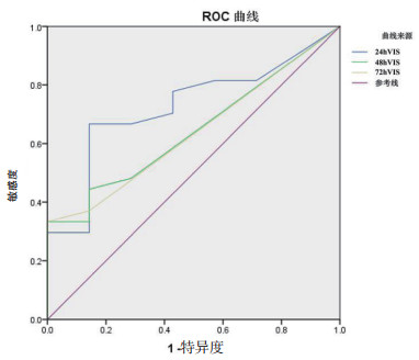 | 图 1 VIS对ECMO患者是否需要RRT的预测价值 Fig 1 Predictive value of VIS for RRT in ECMO patients |