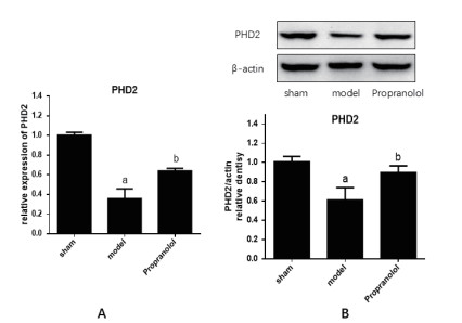 结果表明(图 3):与sham组相比,model组PHD2在mRNA水平上表达量明显下降(P<0.05),同时细胞内PHD2蛋白的含量也显著减少(P<0.05)。而用Propranolol处理后,PHD2在mRNA和蛋白水平上的表达较model组有所上升(P<0.05)。
