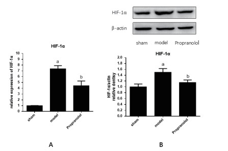 心肌梗死后心衰发生时(图 4),HIF-1α的mRNA以及蛋白的表达量较sham组显著上升,(P<0.05);用Propranolol处理后,与model组相比HIF-1α的mRNA和蛋白含量则变低(P<0.05)。
