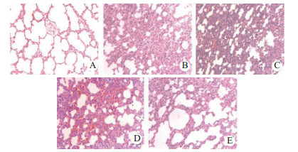 | A:NC组; B:DHC组; C:50 mg/kg姜黄素组; D:100 mg/kg姜黄素组E:200 mg/kg姜黄素组 图 1 姜黄素预处理对热射病大鼠肺组织病理改变(HE×100) Fig 1 Lung pathological changes at different curcumin pretreatment groups of heat stroke rats under dry heat environment (HE×100) |