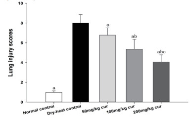 中暑是一种严重危及生命的疾病,据不完全统计我国中暑患者平均死亡率约10% ~15%,其中重症中暑(热射病)患者死亡率 > 40%[1]。尽管通过降温和补液等积极的临床措施迅速恢复患者的体温及中枢神经功能,仍有约30%的热射病患者造成了永久性的神经系统和周围组织损伤[2]。姜黄素是一种黄色色素,存在于香料姜黄的根茎中。在印度阿育吠陀(印度传统医学)中已经使用了几个世纪,用于治疗多种疾病,其治疗作用逐渐被阐明[3]。有研究发现姜黄素的多效性能够与众多分子靶点相互作用参与炎症反应的调节[4]。本研究及既往研究提示沙漠干热环境中暑及热射病可引起急性肺损伤[5-6],由此我们采用不同剂量的姜黄素灌胃干热环境预处理大鼠,初探不同剂量姜黄素对干热环境热射病大鼠肺损伤的保护作用特点及可能机制。