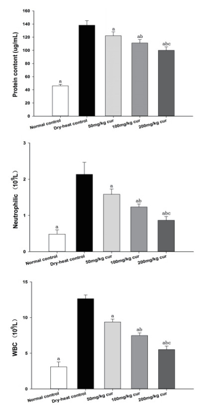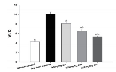 ① 常温对照组(Normal control,NC组),②干热对照组(Dry-heat control,DHC组),③50 mg/kg姜黄素组,④100 mg/kg姜黄素组,⑤200 mg/kg姜黄素组。NC、DHC组生理盐水灌胃,姜黄素各组将姜黄素溶于5%羧甲基纤维素钠溶液配置成混悬液灌胃。