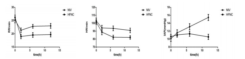 两组患者在氧疗0 h RR、HR、IAP差异无统计学意义(均P > 0.05), 在氧疗2、6、12 h疗RR、HR均有所下降。与NIV组相比,2、6、12 h HFNC组RR、HR、IAP明显低于NIV组,差异有统计学意义(P<0.05)。HFNC组治疗各时间点IAP无明显变化,NIV组呈上升趋势。见图 1。