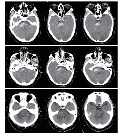 | 图 1 经幕上入路脑干血肿穿刺A:血肿穿刺前B:血肿穿刺后复查C:穿刺后5 d |