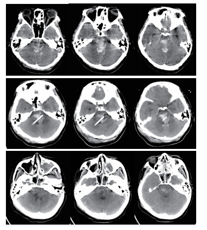 | 图 2 经幕下入路脑干血肿穿刺A:血肿穿刺前B:血肿穿刺后复查C:穿刺后6 d复查 |