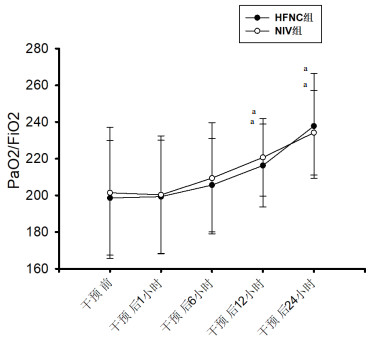 | 注:PaO2/FiO2:氧合指数,PaCO2:动脉血二氧化碳分压;干预后各时间点与同组干预前比较,aP<0.05;同一时间点两组间比较,bP<0.05 | ||||||||||