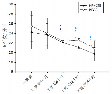 | 干预后各时间点与同组干预前比较,aP<0.05;同一时间点两组间比较,bP<0.05; 图 2 两组患者干预前后呼吸频率变化 |