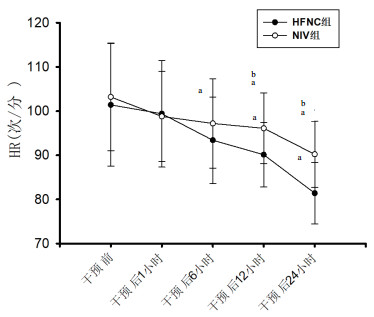 | 干预后各时间点与同组干预前比较,aP<0.05;同一时间点两组间比较,bP<0.05; 图 3 两组患者干预前后心率变化 |