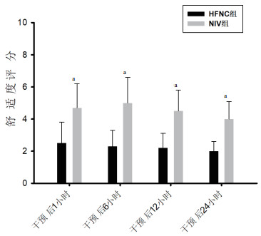 两组患者在干预后1至24 h,氧合指数均逐步改善,呼吸频率、心率逐渐下降,见表 3及图 1、2、3。其中HFNC组患者在干预后12、24 h的呼吸频率、心率均低于NIV组(均P<0.05)。而各时间点的PaO2/FiO2、PaCO2两组比较均差异无统计学意义(均P > 0.05)。HFNC组患者在拔管后1、6、12、24 h的舒适度评分均显著低于NIV组(均P<0.01), 见图 4。