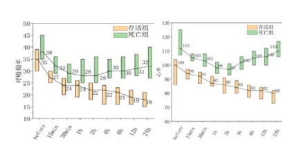 | 箱式图上下代表四分位数QL和QU,图中数值为中位数 图 3 应用HFNC治疗的患者,死亡组与存活组RR和HR随时间的变化规律 Fig 3 Changes of RR and HR with time in the survival and non-survival groups |