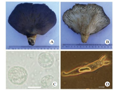 | 图 1 日本类脐菇宏观和微观结构(A-B:日本类脐菇子实体;C:担孢子;D:担子;C-D标尺=10 µm) Fig 1 Macro- and micro structure of Omphalotus guepiniformis(A-B:Basidiomata; C: basidiospore; D: basidium; bars for C-D=10 µm) |