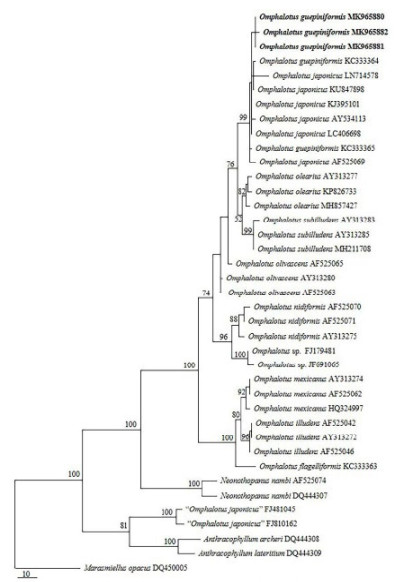 结合形态学、系统发育分析和生态习性,本次报道中的两起中毒事件中的3份毒蘑菇样品鉴定为日本类脐菇(Omphalotus guepiniformis)。