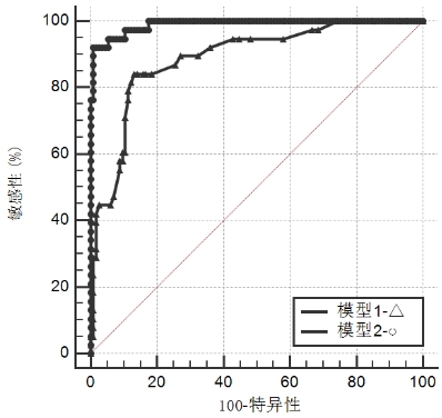 | 模型1:ST段抬高总幅度、合并LVA;模型2:TIT延长、ST段抬高总幅度增加、pPCI术后TIMI血流≤2级、入院前LVEF下降、合并LVA 图 1 两模型间ROC曲线下面积比较 Fig 1 Comparison of area under ROC curve between the two models |