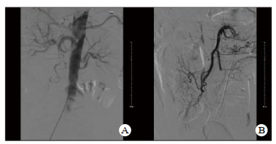 | 图 1 患者术前术后肠系膜上动脉造影结果(A:介入治疗术前造影提示肠系膜上动脉闭塞;B:介入治疗术后造影提示肠系膜上动脉开通) |