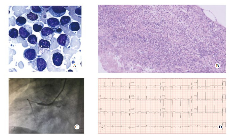 | A:骨髓细胞学检查(Wright-Giemsa染色,×1 000):有核细胞增生活跃,原始细胞增多,胞浆见Auer小体,提示M4白血病;B:冠脉内凝固性坏死物内肿瘤性栓子,免疫组化结果符合AML(×100);C:冠状动脉造影,右冠全闭;D:心电图示窦性心律,STII、III、aVF抬高伴异常Q波,广泛前壁、侧壁ST-T改变 图 1 病例16病理和影像学资料 |