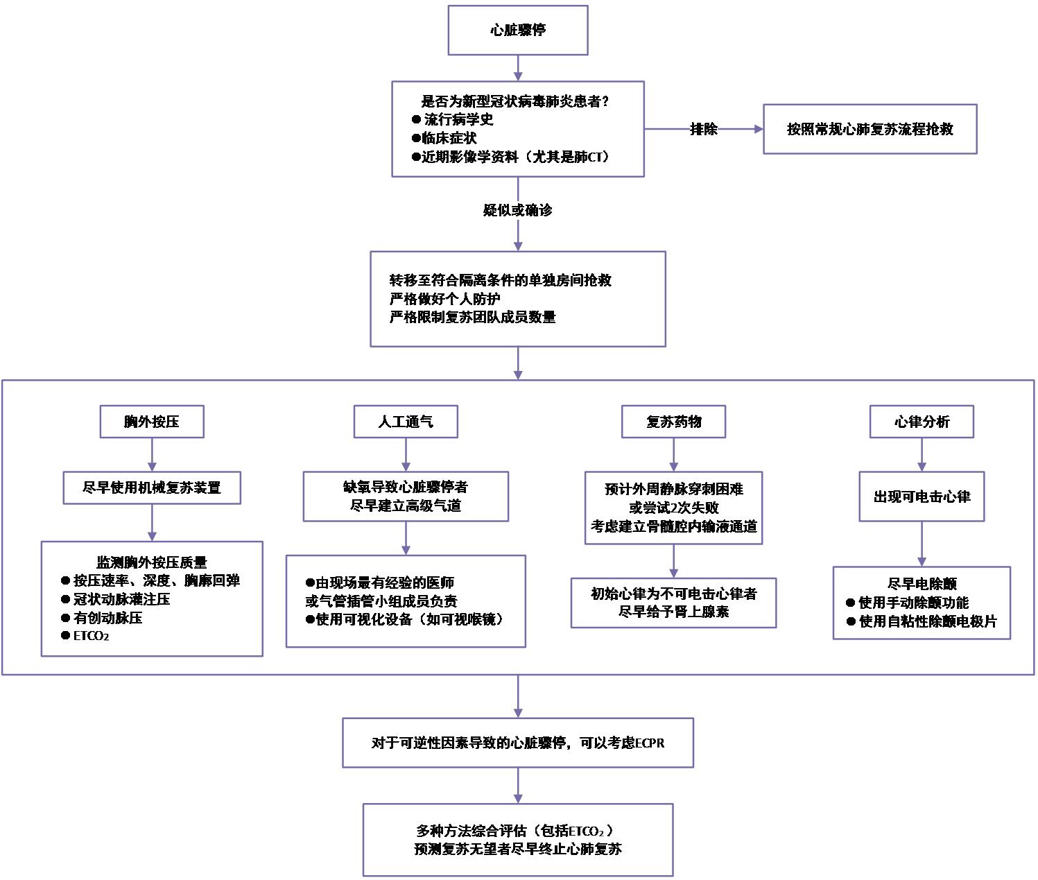 | 图 1 疑似/确诊新型冠状病毒肺炎患者的心肺复苏流程 |