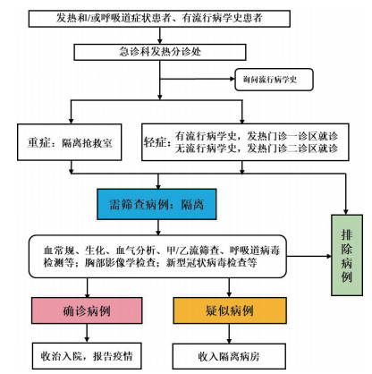 | 图 1 四川大学华西医院发热门诊新型冠状病毒肺炎筛查流程 Fig 1 Screening process of COVID-19 in the Fever Clinic of West China Hospital |