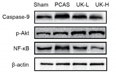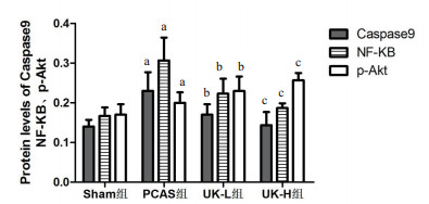 sham组、PCAS组、UK-H组、UK-L组Caspase-9、P-Akt、NF-κB蛋白表达(见图 1)。引入Actin为内参定量分析显示(见图 2):PCAS组、UK-H组、UK-L组较sham组比,NF-κB、Caspase-9显著增加;UK-H组、UK-L组与PCAS组相比,NF-κB、Caspase-9表达显著降低(P < 0.05),且UK-H组较UK-L组明显(P < 0.05)。与sham组比,P-Akt在PCAS组表达升高;与PCAS组相比,P-Akt在UK-H组、UK-L组表达显著升高(P < 0.05),且UK-H组表达更为明显(P < 0.05)。