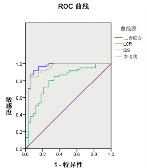 | 图 1 LCR、BIS及其联合预测DEACMP的ROC曲线 Fig 1 ROC curve of LCR, BIS and their combined prediction of DEACMP |