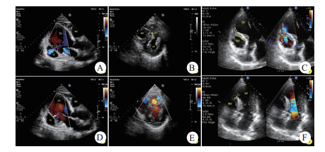 1.3 病例3男,70岁,胸痛2 d,急诊查体发现胸骨左缘第2肋间3~4级性质粗糙的收缩期杂音,心电图提示“前间壁相关导联ST段升高”,床旁超声心动图提示“前间隔、左室前壁运动异常并心尖部室壁瘤形成,室间隔穿孔并夹层,心包腔少量积液”(见图 1-E, F)。该患者放弃治疗。