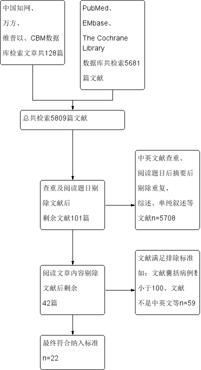 2 结果 2.1 检索结果检索结果 经国内外数据库检索, 初检获得5 809篇文献, 其中维普9篇, 中国知网28篇, 万方74篇, CBM 17篇, PubMed 4 178篇、EMbase 1 310篇、The Cochrane Library 193篇, 按照纳入排除标准进行全面筛选和评价后, 最终纳入22篇文献, 均为病例对照研究, 纳入文献基本特征见图 1, 表 1。