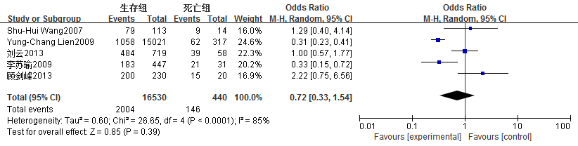 2.2.9 血气胸有5篇文献报道血气胸在胸部创伤中的影响, 各研究间异质性较大(P < 0.00001), 采用随机效应模型分析, 血气胸对胸部创伤患者病死率的影响差异无统计学意义(Z=0.85, OR=0.72, 95%CI 0.33~1.54, P=0.39)。见图 10。