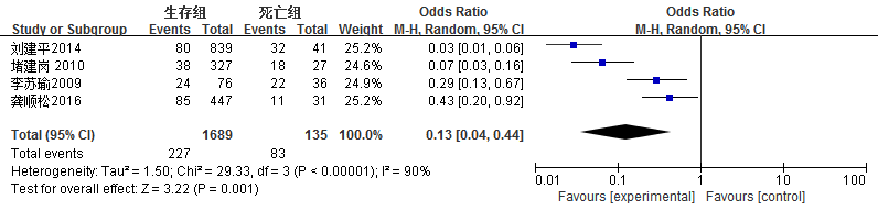 有4篇文献报道受伤前有基础疾病在胸部创伤中的影响, 各研究间异质性较大(P < 0.01), 采用随机效应模型分析, 伤前基础疾病对胸部创伤患者病死率的影响差异有统计学意义(Z=3.22, OR=0.13, 95%CI 0.04~0.44, P=0.001)。见图 11。