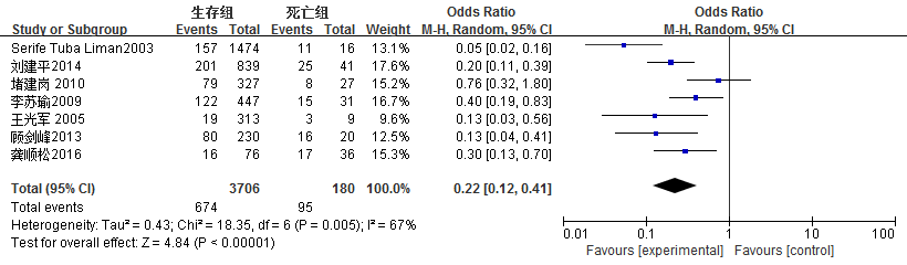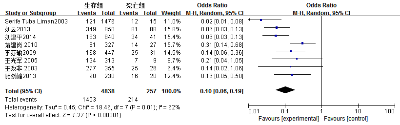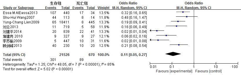 有8篇文献报道心脏损伤在胸部创伤中的影响, 各研究间异质性较大(P < 0.00001), 采用随机效应模型分析, 心脏损伤对胸部创伤患者病死率的影响差异有统计学意义(Z=5.02, OR=0.11, 95%CI 0.05~0.27, P< 0.01)。见图 12。