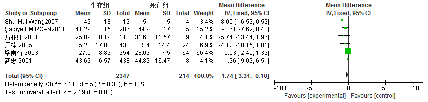 有13篇文献报道年龄在胸部创伤中的影响, 其中7篇文献中年龄为二分类变量, 另外6篇文献中年龄为连续型变量。二分类变量7篇文献中各研究间异质性较大(P=0.005), 采用随机效应模型分析, 年龄大于60岁对胸部创伤患者病死率的影响差异有统计学意义(Z=4.84, OR=0.22, 95%CI 0.12~0.41, P < 0.01);连续型变量6篇文献中各研究间异质性较小(P=0.3), 采用固定效应模型分析, 年龄对胸部创伤患者病死率影响差异有统计学意(Z=2.19, MD=-1.74, 95%CI -3.31~-0.18, P=0.03)。见图 2-3。