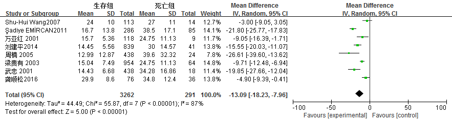 有16篇文献报道ISS评分在胸部创伤中的影响, 其中8篇文献中ISS评分为二分类变量, 另外8篇文献中ISS评分为连续型变量。二分类变量8篇文献中各研究间异质性较大(P=0.01), 采用随机效应模型分析, ISS评分大于16分对胸部创伤患者病死率的影响差异有统计学意义(Z=7.27, OR=0.1, 95%CI 0.06~0.19, P < 0.01);连续型变量8篇文献中各研究间异质性大(P < 0.00001), 采用随机效应模型分析, ISS评分对胸部创伤患者病死率影响差异有统计学意(Z=5.00, MD=-13.09, 95%CI -18.23~-7.96, P < 0.00001)见图 4-5。