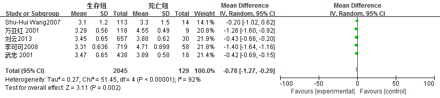 有5篇文献报道胸部AIS评分在胸部创伤中的影响, 各研究间异质性大(P < 0.01), 采用随机效应模型分析, 胸部AIS评分对胸部创伤患者病死率影响差异有统计学意(Z=3.11, MD=-0.78, 95%CI -1.27~-0.29, P=0.002)。见图 6。