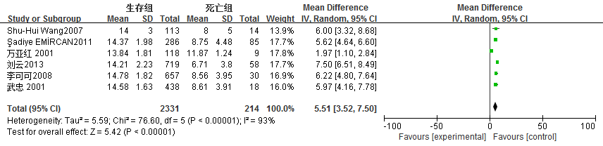有5篇文献报道GCS评分在胸部创伤中的影响, 各研究间异质性大(P < 0.00001), 采用随机效应模型分析, GCS评分对胸部创伤患者病死率影响差异有统计学意(Z=5.42, MD=5.51, 95%CI 3.52~7.50, P < 0.01)。见图 7。