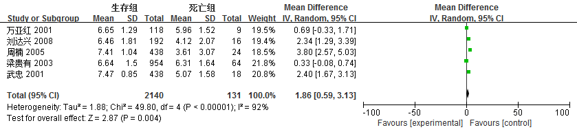 有5篇文献报道RTS评分在胸部创伤中的影响, 各研究间异质性大(P < 0.01), 采用随机效应模型分析, RTS评分对胸部创伤患者病死率影响差异有统计学意(Z=2.87, MD=1.86, 95%CI 0.59~3.13, P=0.004).见图 8。