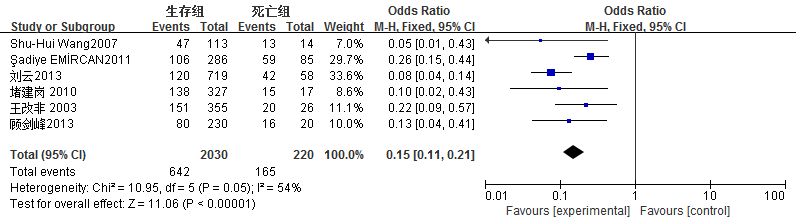 有6篇文献报道休克在胸部创伤中的影响, 各研究间异质性较好(P=0.05), 采用固定效应模型分析, 休克对胸部创伤患者病死率的影响差异有统计学意义(Z=11.06, OR=0.15, 95%CI 0.11~0.21, P < 0.01)。见图 9。