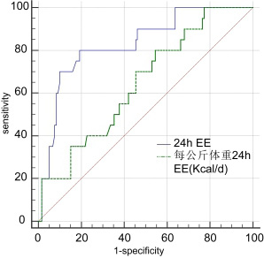 本文研究能量消耗预测多发伤患者的预后价值;IC法测得的24 h能量消耗、每千克体质量24 h能量消耗对28 d病死率的预后评价的AUC分别为0.647、0.663;对是否发生院内感染的预后评价AUC为0.832、0.646。以24 h能量消耗大于2 083 kcal/d作为判断是否易发院内感染的截断值,其敏感度为80.0%,特异度为80.7%;以每千克体质量24 h能量消耗大于30.4 kcal/(kg·d)作为判断28 d病死率的截断值,其敏感度为66.5%,特异度为77.0%。本研究数据说明多发伤患者能量消耗对于是否发生院内感染预测的意义更大一些,能量消耗越高的患者,可能营养的累积负债越多,营养不良的发生率越高,导致院内感染的发生。营养的累积负债的原因:可能是未使用准确评估能量消耗的方法,低估了患者的能量消耗;也可能是多种因素导致营养无法全量供给。本研究数据对于临床工作的提示:对于24 h能量消耗大于2 083 kcal/d多发伤患者,需要警惕院内感染的发生。能量消耗对于28 d病死率的预后评价,与是否发生院内感染的预测相一致,但是能量消耗只是28 d病死率的影响因素之一,需要进行更多的对照研究才能确定能量消耗是否增加多发伤患者28 d病死率。但是本研究结果可以提示临床工作,每千克体质量24 h能量消耗大于30.4 kcal/(kg·d)的多发伤患者,需要特别关注其营养供给,可能会增加患者28 d病死率。如果对营养供给的累积正负平衡做了统计,结合能量消耗则更能预测患者的预后。一项对38例长时间机械通气的重症患者的研究中发现,每天能量负债1 200 kcal,是ICU死亡的独立危险因素(OR=6.12,95%CI:1.33~28.2,P=0.01)[15],和本研究结果相一致。
