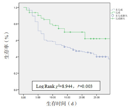 | 图 3 执行3 h Bundle患者的28 d生存曲线 Fig 3 Survival curve for patients with 3 h Bundle completion at 28 days |