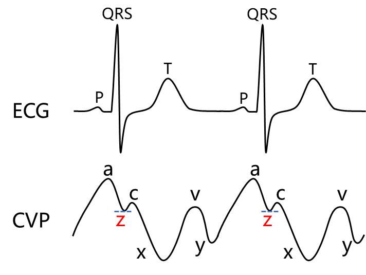 CVP波形及意义(图 3):① a波位于ECG的P波之后,反映右心房收缩功能,其作用是在右心室舒张末期向右心室排血。② c波位于QRS波之后,是右心室收缩,三尖瓣关闭并向右心房突入,导致右心房压一过性增高。③ x波在c波之后,随着右心室的继续收缩,右心房开始舒张,使右心房压快速下降。④ v波位于x波之后,是由于右心房舒张,快速充盈的结果。⑤ y波位于v波之后,是由于三尖瓣开放,右心房快速排空。