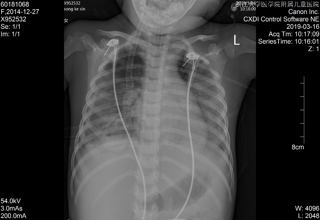 急性呼吸窘迫综合征(ARDS)是糖尿病酮症酸中毒(DKA)的一种罕见并发症,但其病死率很高。1982年Carrol和Matz[6]报道了9例DKA合并ARDS的病例,并描述了此前文献报道过的所有9例DKA合并ARDS的病例,总结发现所有18例病例均为成人,并伴有严重酸中毒及低血压,且其中15例死亡。目前认为,严重的酸中毒、低血压、氮质血症、及可能无法避免的过度液体治疗为DKA合并ARDS的危险因素。本病例可能的机制为:①本病例初诊断时pH为6.87,为极重度糖尿病酮症酸中毒,而严重酸中毒会增加毛细血管通透性,从而导致肺泡表面活性物质活性下降[2];②本病例外院治疗时,液体入量约3 L/24 h,对于体质量10 kg左右的儿童,液体入量极大,而过度水化会增加静水压和减少血管内胶体渗透压,从而可能增加ARDS发生风险[10];③在DKA的发生及治疗过程中,抗炎细胞因子白介素-10显著减少,而前炎症因子白介素-1β、白介素-8及肿瘤坏死因子-α增加,且其间质性肺水肿的发生与各炎症因子的增强同步,这进一步说明了其在ARDS弥漫性肺损伤中的作用;④虽然有些DKA病例,都曾暴露于以上危险因素,但仍只有少数患者出现ARDS,究其原因,可能有一定的基因易感性。目前研究发现,血管紧张素转换酶基因、肺表面活性物质相关蛋白B、白介素-6、血管生成素-2及凝血因子V等的基因多态性与ARDS易感相关。本院内分泌科开设25年来,随着儿童糖尿病发患者数的上升,而儿童1型糖尿病多以DKA就诊,现每年收住DKA患者约50多例次,其中不乏pH值低于6.9的,且伴随低血压的,但DKA合并ARDS为第一例,基因易感性加上多因素共同作用也许能解释其中原因。目前针对ARDS的主要治疗方案是积极治疗潜在病因、机械通气及高流量氧疗,必要时可应用VV-ECMO[7]。而本病例患儿,经过积极治疗后,随访近1年,无明显后遗症生存状态。