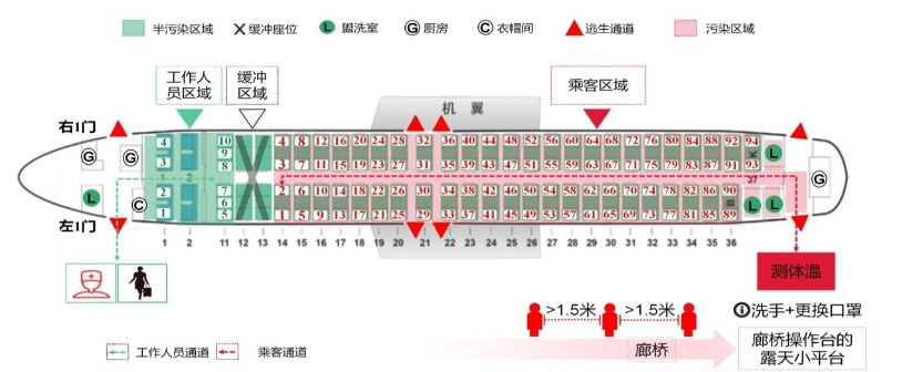 ① 登机流程:提前在值机柜台放置手消毒物品及一次性口罩,保证每位值机旅客均佩戴口罩,广播登机流程及注意事项,安排旅客登机前用餐;尽量让旅客从飞机后门登机,前门作为工作人员通道。最优方案是选择空旷停机坪和客梯车登机,尽量不使用廊桥,若必须使用廊桥,则单次指引十人进入廊桥排队,每人间距1.5 m。医务人员负责旅客的体温测量,并指引无发热的旅客单人依次进入廊桥操作台的露天平台,由两名乘务人员协助其洗手和更换口罩后旅客顺序登机。