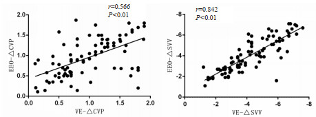 | 图 3 EEO-ΔCVP与VE-ΔCVP以及EEO-ΔSVV与VE-ΔSVV的相关性分析(n=57) Fig 3 Correlation analysis between EEO-ΔCVP and VE-ΔCVP, EEO-ΔSVV and VE-ΔSVV (n=57) |