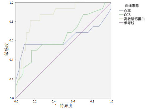 2.4 入院时相关指标对iTBI患者并发心功能不全的预测价值以入院时血清hs-cTnT水平、心率、GCS评分为检验变量,以是否发生心功能不全为状态变量,ROC曲线(图 1)显示,入院时血清hs-cTnT水平ROC曲线下面积最大(0.863),见表 3。