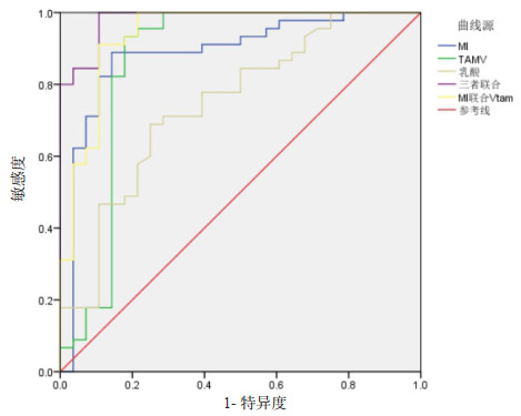| 图 1 MI、TAMV、血乳酸及三者联合对判断重症患者发生急性胃肠损伤的接受者操作特征曲线 Fig 1 The operation characteristic curve of MI, TAMV, blood lactic acid and their combination to judge the recipient of acute gastrointestinal injury in severe patients |
